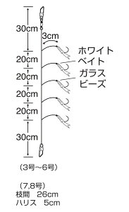 商品説明: ・堤防サビキの新定番!実績のホワイト仕様。 ・サビキ仕掛けに迷ったらコレ! 仕様: ・号数:4 ・サイズ:全長1.4?1.6m ・ハリス:0.6 ・モトス:1 ・鈎、パーツ:小アジ丸軸(金)、ガラスビーズ ・入数:5本鈎×...