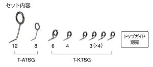 アジングロッドなどに最適なチタンSiCガイドセットです。 ◆セット内容 T-KTSG4/3個 T-KTSG4/1個 T-KTSG6/1個 T-ATSG8/1個 T-ATSG12/1個 ※トップガイドは別売りです。 推奨トップガイド T...