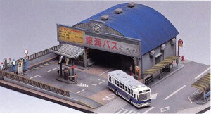 ※画像は※完成見本です。現在付属のシールが異なっております。※地方の駅前でよく見かけるバス車庫・営業所・ターミナルが一緒になった建物キットです。正面に大きな路線図や観光案内看板を掲げたアーチ屋根のガランとした車庫は、