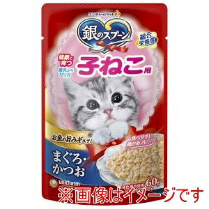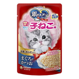 メーカー:ユニチャームお魚の旨みギュツと!銀のスプーンパウチ 健康に育つ子ねこ用 まぐろ・かつお 60g対象猫機能総合栄養食ライフステージ生後12ヶ月までの子猫特長●幼猫用総合栄養食キャットフードです...