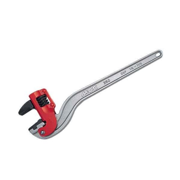 【用途】配管の被覆パイプ・継手などを締付けるレンチ。【機能・特徴】配管材料を選ばない、幅広い締付けが出来ます。コーナー部、溝の中などの狭所の配管作業に最適です。アルミハンドルの採用により30%軽量化しました(同メーカー
