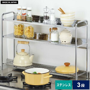 商品説明コンロの奥に多段収納をプラス。グリルの排気や三つ口コンロを避けた構造の棚仕様。下段の網棚には鍋やフライパンも置けて、上の2段には調味料やちょっとした道具が置けて便利。下段にはくぼみがあるので3口コンロにも対応...