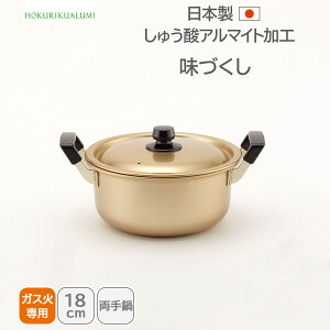 cm◆商品名:北陸アルミ 両手鍋 18cm ガス火専用 軽量 純しゅう酸 味づくし 日本製サイズ:18×8.9商品紹介お正月、お盆、お祭り、パーティ、催事に、ホクアゴールド“味づくし”●耐久性に優れた純蓚酸鍋●強力アルマイト