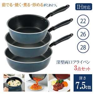 フライパン3点が揃ったお得なセット商品です。 焼く・炒める・煮る・茹でるがこれ一つ、深型だからフライパンとしてもお鍋として使えるミリ・オーネ深型両口フライパン。 深さ(約)7.5cmでこれ一つ