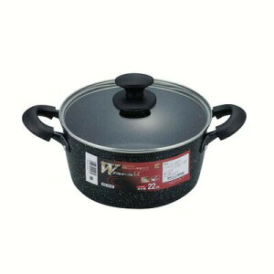 ふきこぼれにくいIH対応両手鍋。こびりつきにくく、耐摩耗性に優れた「クイックマーブル」特殊フッ素樹脂を内面に塗装。金属製のお玉やヘラの使用OK。蓋は立てて置けるハンドル付き。IH・ガスコンロに対応。サ...
