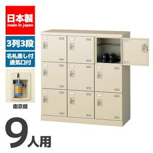 使用する人が各々で南京錠を使用して施錠・解錠ができます。南京錠は別途お買い求めください。 商品名3列3段9人用(南京錠) カラーニューグレー サイズ[外寸]幅900×奥行350×高さ945mm[内