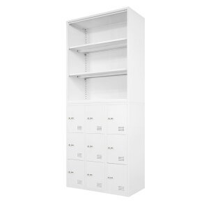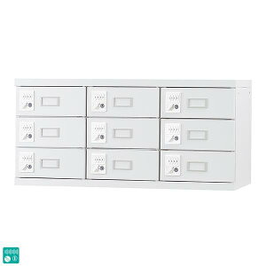 網棚・カギ付き。衣類と小物を分けて置ける9人用ロッカー/3列3段明るく清潔感のあるホワイト色。開閉が一目で分かる表示機能付き。棚板付きで貴重品や衣類や小物を分別できます。