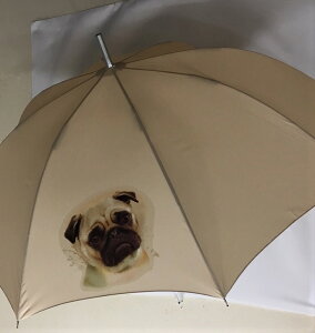 パグ柄がプリントされた65cmのサイクロンジャンプ傘です。<素材> ポリエステル100% ポンジー<サイズ>使いやすい65cmタイプです。<カラー>ベージュのみプリント可能・風速25m/sでも大丈夫 風に対して強度は、5倍!!・親骨は、丈