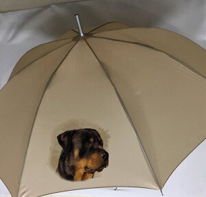 ロットワイラー柄がプリントされた65cmのサイクロンジャンプ傘です。<素材> ポリエステル100% ポンジー<サイズ>使いやすい65cmタイプです。<カラー>ベージュのみプリント可能<プリント>実際の傘には、商品説明左側にある、絵