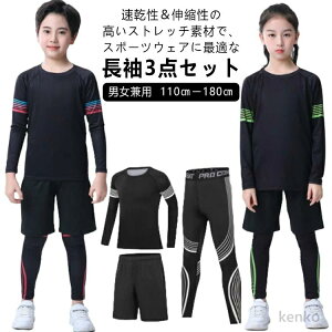 速乾性&伸縮性の高いストレッチ素材で、スポーツウェアに最適な長袖3点セット。【男女兼用】【110cmー180cm】セット内容:長袖トップス、ロングレギンス、ハーフパンツ。インナーウェアとしても、またカ...