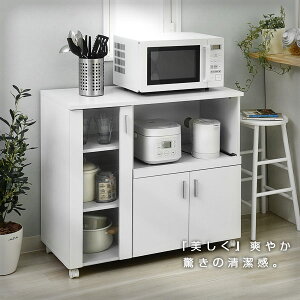 優しい木目調でシンプルデザインのキッチン家具「ラフィカ」シリーズのレンジラックです。二か所のスライドトレー、キャスター付きワゴン、可動タイプのオープン収納が組み合わさり、機能性抜群です。これ一台で調理家電から食器、小物類まで全て収納で...