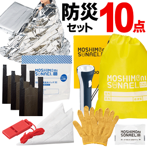 モシモニソナエル防災10点セット 活用頻度の高い商品を厳選した、必需品10点! 緊急時は備えが肝心!1セットあると安心♪ ▼災害時・緊急時のマストアイテム10点セット!▼ ●持ち出し袋 ●防災ブック ●LEDライト ●アルミシート