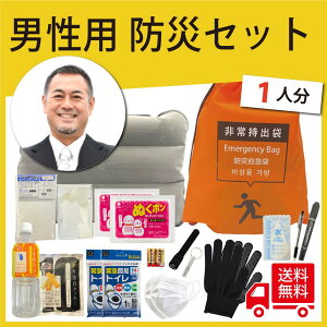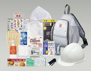 、小型懐中電灯、簡易トイレや備蓄用長期保存水、カンパンなどの防災グッズをひとまとめにした一人用防災セット。 災