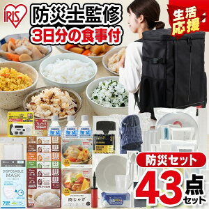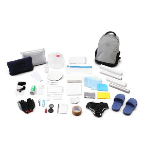 災害時に役立つ用品をセットにした防災リュックです。食品付きの1人用43点入りセット、防災マニュアル付きです。リュックは雨天時も安心の、水に強いターポリン生地・止水ファスナーを採用しています。※リュックは完全防水ではありま