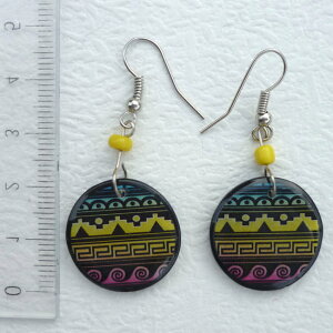 陶器製の、丸型ピアスです。裏側は黒色1色です。 ペルーのインカ時代柄・幾何学などを参考に描いてあります。 表面は、綺麗で可愛いと思います。 フォルクローレ音楽の、衣装のアクセサリーとしてもいかがですか...