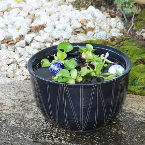 品 番 su-0250 金魚鉢、めだか鉢にお勧めの水鉢 品 名 信楽焼 楕円型ブラック立線水鉢 [送料無料] 浮き球2個付き!(絵柄は当店にお任せください) サイズ・重量 幅350×奥行330×高さ210mm...