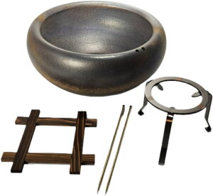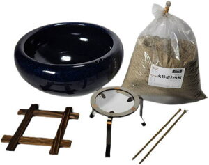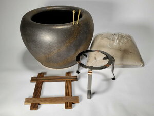 B026-03 砂釉金彩火鉢型灰皿セット 6号(火箸・五徳・井ゲタ付き) サイズ:W305×H210 mm 目安として火鉢サイズにより下記の灰を入れます。 10号火鉢・・・1袋 (5.0L×1袋)以上 11号火鉢・・・