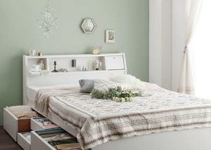 商品名クイーンベッド 家族 ファミリー 親子 ワイド マットレス付き チェストベッド ミドル ベッド下収納 引き出し付き 大容量 宮付き ヘッドボード 枕元 棚 ラック 携帯置き ティッシュ置き メガネ置き リモコン 頭上 収納 コン...