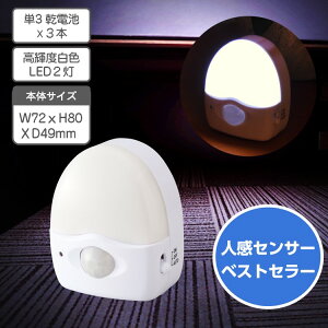 ・製品重量(g):58 ■商品説明 ・コンセントのない場所でも使用できる、乾電池式。 ・センサーモードと常時点灯の点灯切替付きです。 ・マグネット、吊下げフック付、スタンド置きが可能です...