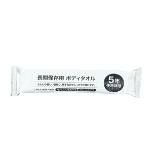 災害時や非常時に備えておきたい、5年間の長期保存が可能な日本製のボディタオルです。 タオルサイズは56×28cm、パッケージサイズは20×5cmとコンパクトで持ち運びにも便利。 素材はレーヨン不織布で、水やお湯が使えない状況でも体を拭き
