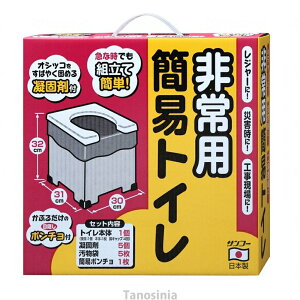 ・組み立て簡単、非常時の簡易トイレ。 ・本体を開いて、脚キャップで固定し、便器をのせるだけで簡単に組み立てできます。耐荷重量約120kg。 ・急な時でも組み立て簡単。おしっこをすばやく固める凝固剤付。 ・かぶせるだけの簡易ポン