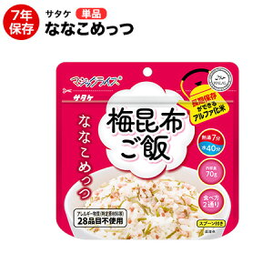 アレルギー特定原材料等28品目不使用 梅のさわやかな酸味と、昆布のうま味が絶妙に調和した、梅昆布ご飯です。 「マジックライス ななこめっつ」はグリーン購入法に適合した商品です。 ■7年間の長期保存 保存期間を従来の5年間から7年