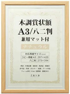 【仕様】 対応サイズ:賞状用紙A3 297×420mm 額縁外寸:328×452mm マット1枚付ハ二判窓付 263×384mm 重量:650g 本体:樹脂 面材:樹脂 包装:シュリンク その他:壁掛け用金具、吊り紐付 縦横兼用・掛けのみ