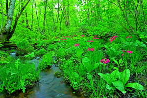 【猫魔の渓流】 裏磐梯猫魔スキー場入り口付近の渓流です。 新緑に包まれた渓流と苔むした岩の鮮やかな美しさ。 あなたの部屋やオフィスも、このパネル1枚でヒーリングスペースに。 あふれんばかりの新緑と清らかな流れ、癒しの風景写