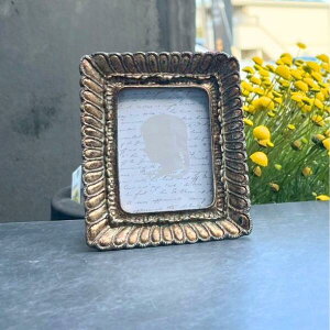 エレガントな装飾のミニフォトフレーム。 古びた風合いをエイジング加工で表現しています。 洋書やアンティーク雑貨と一緒に並べると、お部屋の雰囲気がぐんと華やかに♪ 飾ってあるだけで、とても絵になります。 アンティークな雰囲気