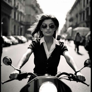 【このポスターについて】 エレガントな都市の風景を背景に、バイクに乗る女性の姿を捉えたこのポスターは、時代を超えたスタイルをお部屋にもたらします。クラシックな白黒写真は「ローマの休日」を彷彿とさせ、無駄のないシンプルな