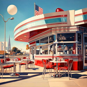 【このポスターについて】 このポスターは、70年代や80年代のアメリカのエッセンスを凝縮したデザインです。モチーフには、活気に満ちた人々の様子、光輝くマッスルカー、そしてレトロなダイナーが取り入れられており、その時代の自由