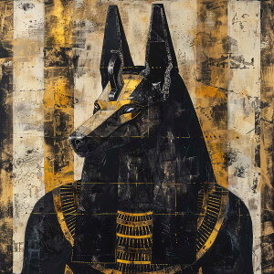 【このポスターについて】 古代エジプトの守護者、アヌビスをモダンな抽象画に仕立てたこのポスターは、歴史と神秘をインテリアに吹き込む一枚です。神話の領域からインスピレーションを受け、アヌビスの力強いシルエットと象徴的な属