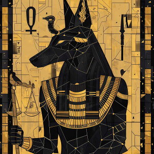 【このポスターについて】 古代エジプトの守護者、アヌビスをモダンな抽象画に仕立てたこのポスターは、歴史と神秘をインテリアに吹き込む一枚です。神話の領域からインスピレーションを受け、アヌビスの力強いシルエットと象徴的な属
