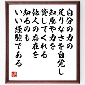自覚し、知恵や力を貸してくれる他人の存在を知るのもいい経験である」を書道家が毛筆書道で色紙に直筆、額に入れてお届けします。当店では挑戦、努力、成功、幸福、感謝、成長、家族、仕事、
