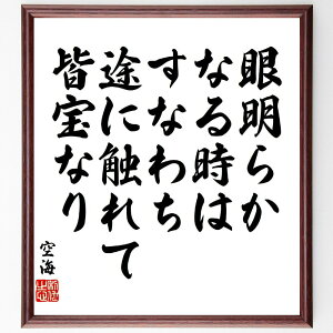【商品説明】空海の名言「眼明らかなる時は、すなわち途に触れて皆宝なり」を書道家が毛筆書道で色紙に直筆、額に入れてお届けします。当店では挑戦、努力、成功、幸福、感謝、成長、家族、仕事、自己啓発など様々なテーマから人生の