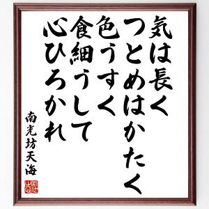 【商品説明】南光坊天海の名言「気は長くつとめはかたく色うすく、食細うして心ひろかれ」を書道家が毛筆書道で色紙に直筆、額に入れてお届けします。当店では挑戦、努力、成功、幸福、感謝、成長、家族、仕事、自己啓発など様々なテ