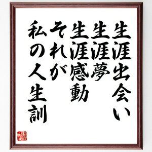 【商品説明】名言「生涯出会い、生涯夢、生涯感動、それが私の人生訓」を書道家が毛筆書道で色紙に直筆、額に入れてお届けします。当店では挑戦、努力、成功、幸福、感謝、成長、家族、仕事、自己啓発など様々なテーマから人生の糧と