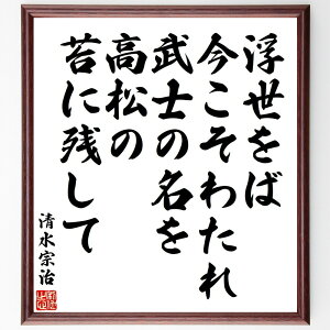 【商品説明】清水宗治の名言「浮世をば今こそわたれ武士の名を高松の苔に残して」を書道家が毛筆書道で色紙に直筆、額に入れてお届けします。当店では挑戦、努力、成功、幸福、感謝、成長、家族、仕事、自己啓発など様々なテーマから