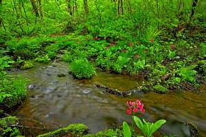 【猫魔渓流】 裏磐梯の五色沼の南西部に位置します。 自然あふれる静かなエリアで、苔マニアにも人気があります。 【クリンソウ】 クリンソウ(九輪草)は、別名:七階草、宝塔華、七階草 小さな花が数段に咲く様子が、仏塔の先の「九