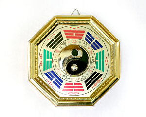 風水 壁掛け八卦ミラーの解説 ◇吊り下げ型の壁掛け八卦(ミラー付)です。 表面の中央には丸鏡を配置し、その周囲に一生平安を願う十二支を記しています。 裏面には宇宙の根源といわれる陰陽のバランスを保つ”太極図”が描かれていま