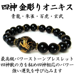 四神獣 オニキス 天然石 魔除けのお守り 風水 運気上昇 四神相応 人気 メンズブレスレット パワーストーン 高品質16mmのオニキスに、金彫りの四神獣が描かれたおすすめブレスレット。オニキスに