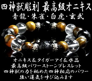 ースブレスレット(女性用) 全て天然石を用い、魔除け厄除けのブラックオニキスに全方位を護り、風水上の理想的な場所を作り出すといわれる「四神獣(ししんじゅう)」を彫刻した邪気払いブレスレット。<b...