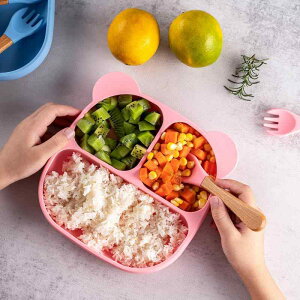 っかり固定し、食事中にひっくり返る心配がなく掃除もラクになります。 【仕切りデザイン】食材を分けて盛り付けられる仕切り付きプレートで、栄養バランスを考えた食事をサポートします。 【楽しく食事】かわいいデザインでお子様の注目を集め...