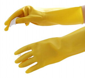 手荒れを防止!水仕事の必需なグローブです。肘下までの38センチのロングタイプで、水が入りにくくなっています。靭性が良くて、引き裂きに強く、耐久性に非常に優れた家事用ゴム手袋。手へらと指先に滑り止め凹凸加工を施し、滑り止