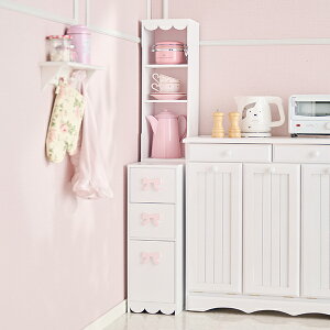 リボンにスカラップフリル♪かわいいを詰め込んだ収納ラック♪幅20cmでちょっとした隙間を有効活用できる隙間収納ラック。フロントの淡いピンクのリボンがとびきりガーリーで、オープン部のスカラップフリルがかわいい。オープン部の背