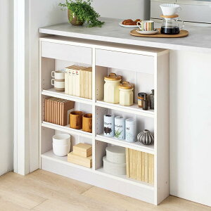 奥行わずか15.5cmのスリム設計ながら、引き出しも付いて収納力はしっかり。高さもカウンター下に収まりやすく、本やDVDはもちろん、棚板には着脱可能なこぼれ止め付きなのでグラスや小皿などの食器類、細かな日用品まで安心してまとめて