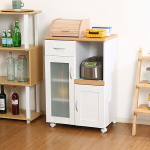 キッチンワゴン 白のポイント ■キッチン用品がたっぷり収納できる引き出しが便利。■天板付きのキッチンワゴンは木目がおしゃれな白色。■天板はタイルなので炊飯器やポットを置いても安心。■3段の棚は高さ調節できるので調味料も楽に収。