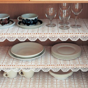 ●EVA樹脂素材の食器棚シート、2枚組●レース調の柄が使いやすく、端のスカラップ部分を棚板からたらして使うことができてインテリアのアクセントにも●食器棚だけでなく、玄関やキッチンのカウンターにも使えます...