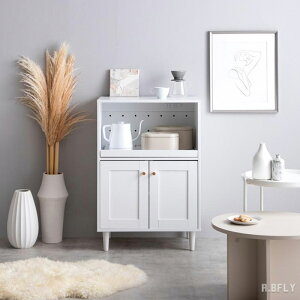 【柔らかなニュアンスカラーで甘すぎない大人な可愛さのファニチャーシリーズ一覧はこちら】 品のある框(かまち)デザインと柔らかなニュアンスカラーが印象的なレンジ台。 シャンパンゴールドの取っ手と美しい框デザインはお部屋のアク