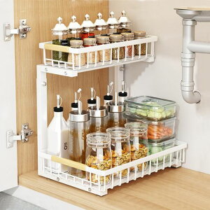 スペースを節約】このキッチンシンク下収納ラックは巧妙なC形デザインを採用し、キッチンやバスルームのシンク下に置くのに最適です。下部には適切なスペースがあり、高いボトルを簡単に収納でき、キャビネット